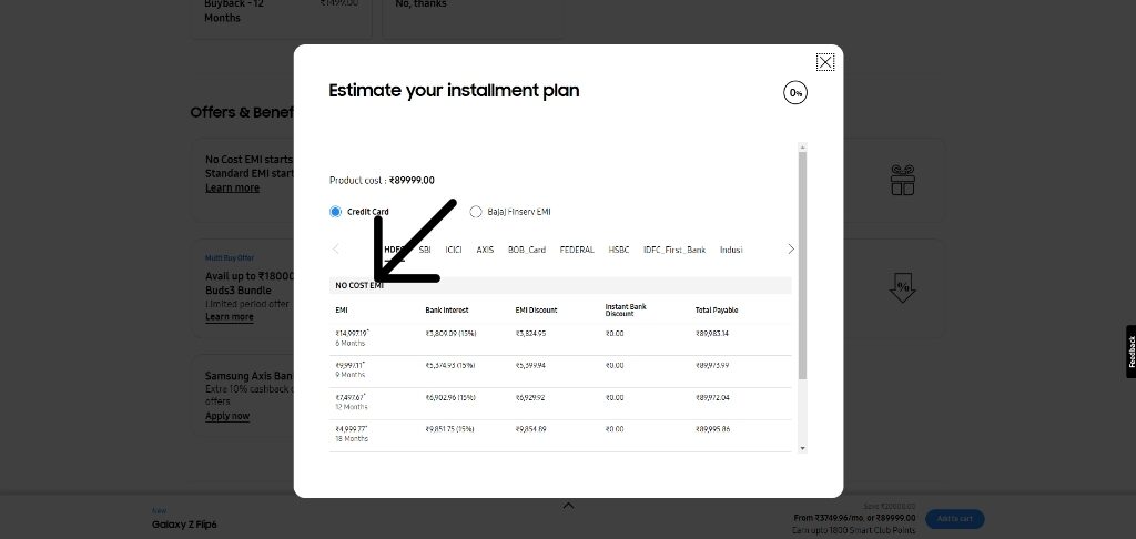 3. New Popup Will open you can view the Bank and No Cost EMI Details as shown in below Image.